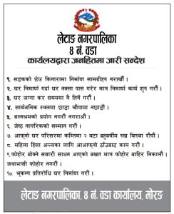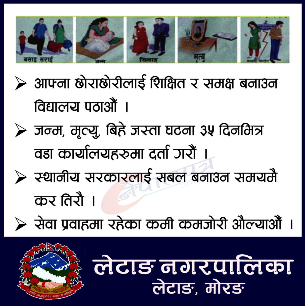 संस्थाले आज जनसेवा सामुदायिक बनको सभाहलमा गरेको कार्यक्रममा लेटाङ नगरपालिकाका प्रमुख शंकर राई प्रमुख अतिथी रहनुभएको थियो । प्रमुख अतिथी राईले कार्यक्रमलाई सम्बोधन गर्दै गाग्रीमा खोला खोल्सा बाट बोकेर खानेपानी खानुपर्ने लेटाङ बासीको बाध्यता आफु खानेपानीको अध्यक्ष हुँदा सानासहरी आयोजना ल्याएपछी हटाउन सफल भएको बताउनुभयो । उहाँले स्वस्च्छ खानेपानी खुवाउन खानेपानी संस्था सक्षम भएको बताउदै खानेपानीलाई मजबुद बनाउन सवै लागि पर्नुपर्नेमा जोड दिनुभयो । उहाँले कोरोनाका कारण लेटाङबासीको आर्थीक अवस्था खस्केको भन्दै खानेपानीको मासिक शुल्क घटाउन सल्लाह दिनुभयो । नगरप्रमुख राईको पहलमा उपभोक्ता बाट माशिक शुल्क घटाएर लेटाङ नगरपालिकाले खानेपानी संस्थालाई बार्षीक पच्चीस लाख रुपैया आर्थिक सहयोग गर्ने सम्झौता गरिएको जानकारी दिनुभयो । उहाँले नगरपालिकाको उक्त सहयोगले उपभोक्ताहरुलाई आर्थिक बोझ कम हुने र खानेपानी संस्था समेत अप्ठ्यारोमा नपर्ने बताउनुभयो । कोरोनाको कहरले दयनीय भएको खानेपानीलाई सजिलो बनाउन नगरपालिका सधै सकारात्मक रहेको वताउनुभयो ।